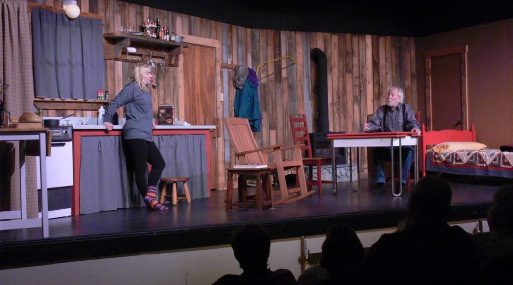 I heard about the play when I talked to a director from a nearby university who had just finished a very different approach to the play:  Five universities from Boston to Washington State, rehearsed the play at the same time.  Then the female actors went to another university for the performance.  Think about it:  When the female actress opens the door of his cabin, she is on a set she has never seen before, facing an  actor she has never met.  Knowing her lines but having no idea how the blocking (movement) will unfold.  Imagine how scary that would be.  The next weekend the actresses went another university until, on closing weekend, she was finally back home acting in the play she had rehearsed.  A wonderful concept – something I have tried to figure out a way to do it locally but maybe on a smaller scale.