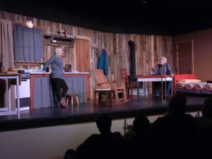 Anyway, I got the script to see what it was about.  I really liked it but . . . I saw a very different play than Cindy Johnson had in mind when she wrote it.  First I saw older actors, actors tho had a lifetime of experiences to bring to their characters.  Actors who have experienced more than a pair of 20 year old actors could ever experience.  I also saw a very real set.  The raw wood boards that make the walls, a small cabin where someone could hide from the world.  I knew that if I went forward with the play, I would have to be true to my vision of the play.  I’ve attached a photo of the set and actors.