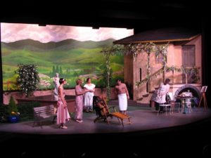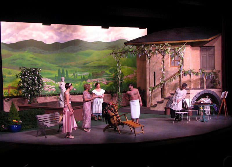 The technical requirements are minimal- the walls of the set are fixed: Usually three doors and a window. Plays are very limited in their set up take down time so the set decoration is minimal. It is about the plays and the acting not the set. The lights are a standard wash with a special for each show. Each show provides its own pre and post show music.
